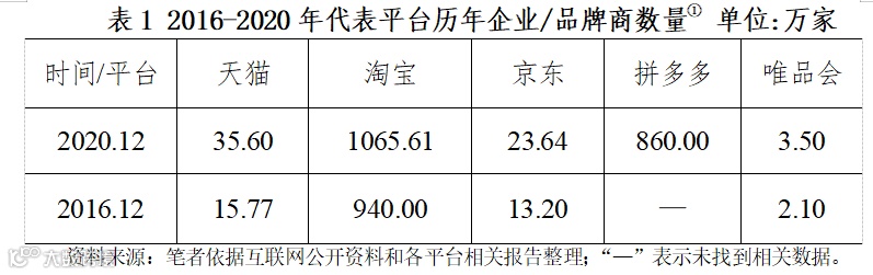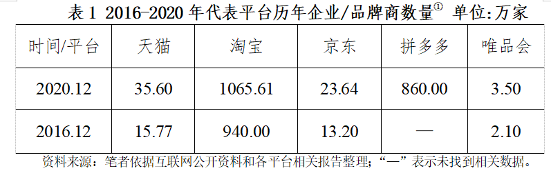 大型平台不仅是一个规模巨大的企业,还是巨量交易场所和联接广泛的基础设施提供者。平台上有数以十万计、百万计的商家和以千万计甚至亿计的消费者,提供的商品和服务内容丰富,数量庞大,交易和交互数量巨大,是一个局部市场。同时,平台联接范围极广,接入平台成为企业参与分工与协同网络的基础条件,因此平台也具有基础设施的性质。以下是几个代表性购物平台上的企业/品牌商数量(表1)。