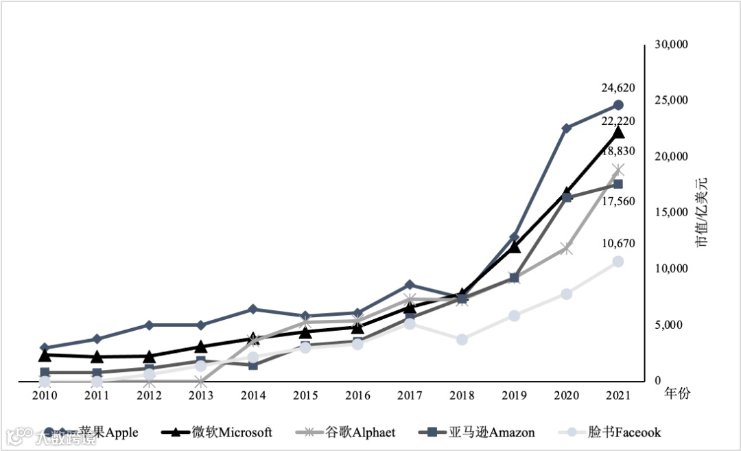 大平台监管也是世界难题,虽然欧盟和美国早有监管大平台的理念、政策和法律,但并未能有效遏制大型数字平台的市场力量。最近几年,在美国和欧盟,“资本力量过于强大”“科技公司垄断市场”的质疑不断,监管部门也不断出台监管政策,但几个大平台的市值反而呈现快速上升,可见数字时代平台监管的难度(见图9)。