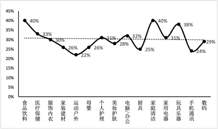 第二,品牌上新迅速。由于平台推出新品牌成本低见效快,入驻平台成为新品牌特别是新消费品牌入市的主要渠道,新品牌产生活跃,呈现高占比。以京东为例,15个行业在2019年4月至2020年3月间新晋品牌的数量占该行业全部品牌的比重均在20%以上,有些行业高达40%(图3)。