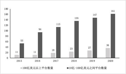 过去6年,我国数字平台经济呈现大规模发展,截至2020年底,我国价值超过10亿美元的数字平台企业有197家,比2015年增加133家;2015-2020年间,我国超过10亿美元的数字平台企业价值由7702亿美元增长到35043亿美元,年复合增长率达35.4%,并呈现中型平台规模不断扩张且成长为大型平台加速的趋势(图1)。