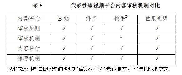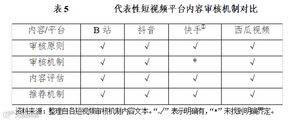 内容审核是文字信息和视频发布平台保障内容合规的重要自治手段,平台希望通过审核机制,能够规范平台上主体行为、创造良好平台环境和社会形象。通过对国内代表性短视频平台审核机制的分析,平台内容审核总体可以概括为审核原则、审核机制、内容评估、推荐机制等(见表5)。以抖音为例,其通过“机器检测、人工检测、用户反馈、叠加推荐”等的多重机制,努力实现对视频内容的把关,优荐劣汰。