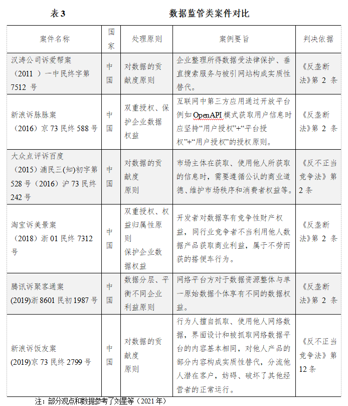 与个人信息保护已有法律规范不同,企业数据权属和应用监管秩序仍在探索,并且处于持续调整完善过程中。对于企业运营中产生的业务数据(非个人数据),法院通过典型案例判决,例如在“汉涛公司诉爱帮案”“大众点评诉百度”“新浪微博诉饭友”“阿里巴巴诉码注”“淘宝诉美景”等多起案件,通过法律判决探索和规范数据市场的运行秩序,明确了对企业数据权益的保护。从2011年到2019年国内典型的关于企业数据和个人数据获取的判例来看,对于数据要素的监管可以概括为以下几点(见表3)。