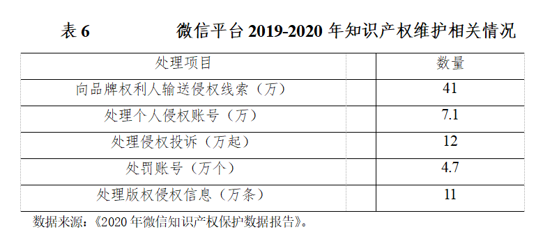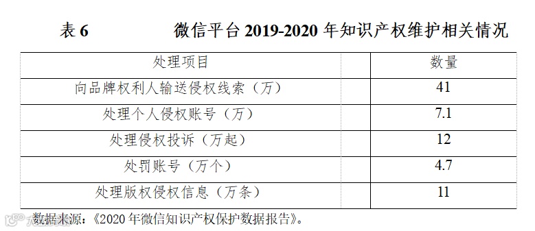 微信作为目前最大的社交平台,每天发布原创文章3万—4万篇,平台通过标注“原创”印记,实施品牌保护。截至2019年上半年,微信平台三年累计超过1亿的文章被标明“原创”。 对于侵权者,采取处理个人侵权账号、禁止使用朋友圈、向品牌权利人提供仿冒品信息线索等(见表6)。