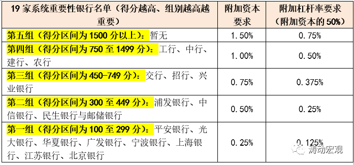 需要说明的是,金融稳定理事会将全球系统重要性银行分成五组,并分别适用1%、1.50%、2%、2.50%和3.50%的附加资本。