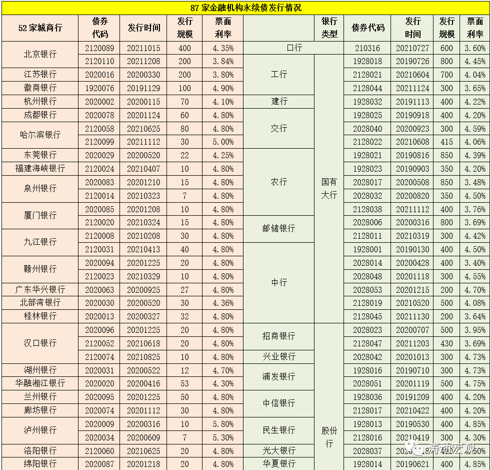 2、据统计,目前已有87家金融机构完成了永续债的发行,具体包括进出口银行(600亿元)、全部6家国有大行(9215亿元)、12家全国性股份行(5960亿元)以及52家城商行(2476亿元)、12家农商行(269亿元)、1家民营银行(40亿元)和3家金融资产管理公司(300亿元)。