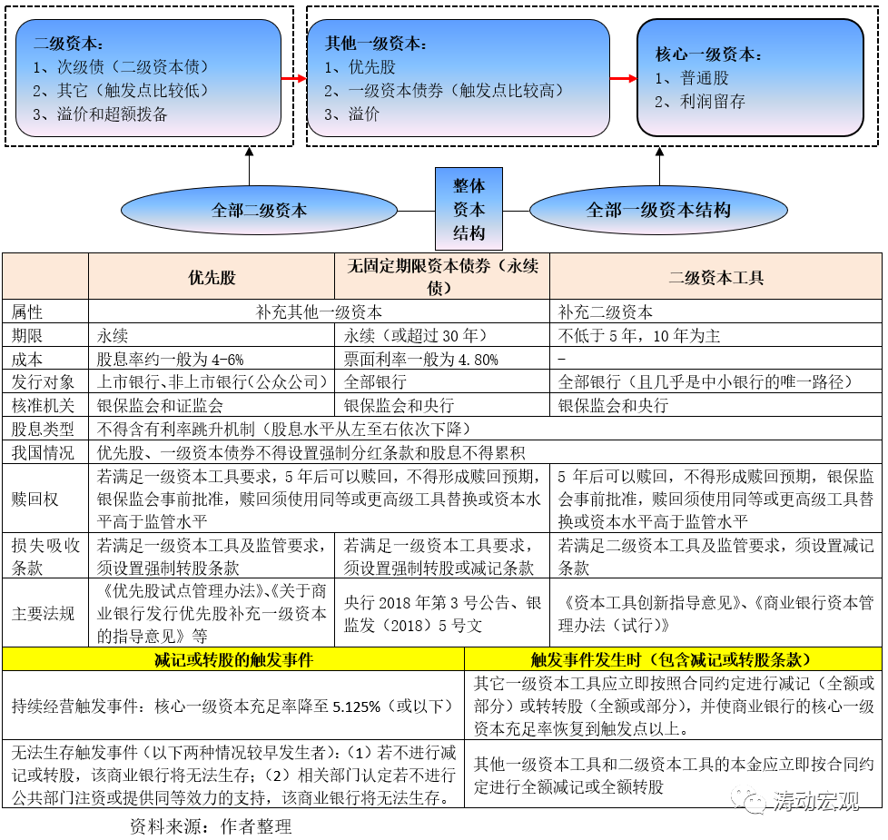 1、国内资商业银行的资本主要包括核心一级资本(普通股和利润留存等)、其它一级资本(优先股和永续债等)以及二级资本(二级资本债等),按照受偿顺序从前到后依次为二级资本、其他一级资本和核心一级资本的整体情况。