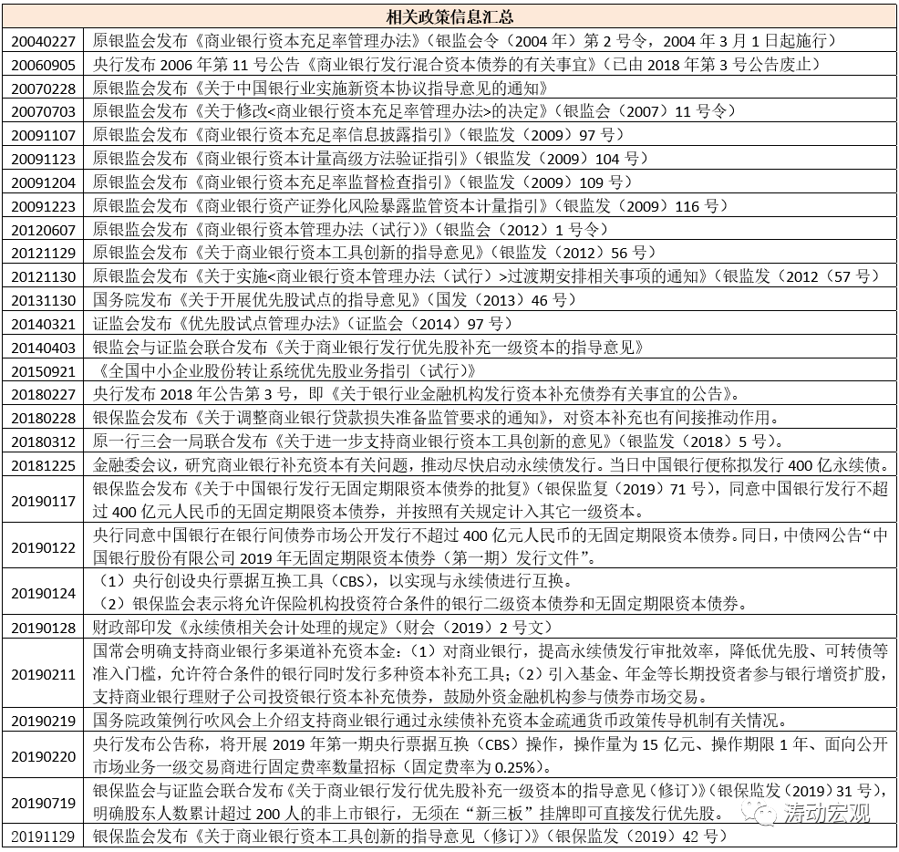 例如,2019年2月11日的国常会便明确支持商业银行多渠道补充资本金:(1)对商业银行,提高永续债发行审批效率,降低优先股、可转债等准入门槛,允许符合条件的银行同时发行多种资本补充工具;(2)引入基金、年金等长期投资者参与银行增资扩股,支持商业银行理财子公司投资银行资本补充债券,鼓励外资金融机构参与债券市场交易。