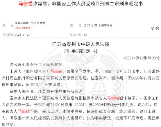 作为该案的被告,马某锴1988年12月15日出生,常熟农商行泰兴支行原行长助理。2020年10月27日,马某锴被刑事拘留,同年12月1日被逮捕。