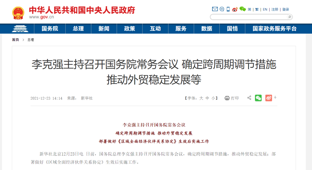 国务院总理李克强主持召开国务院常务会议,确定跨周期调节措施,推动外贸稳定发展;部署做好《区域全面经济伙伴关系协定》生效后实施工作。