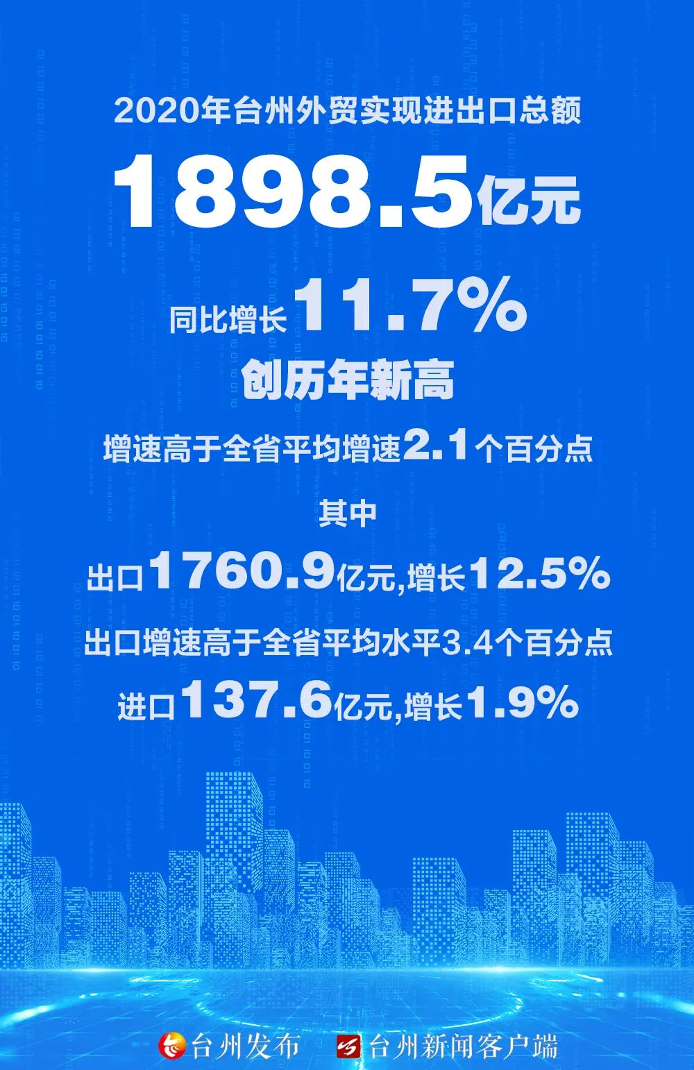 据统计,2020年台州外贸实现进出口总额达1898.5亿元,同比增长11.7%,进出口总额居全省各地区第7位,创历年新高,增速高于全省平均增速2.1个百分点。其中,出口1760.9亿元,增长12.5%,出口增速高于全省平均水平3.4个百分点;进口137.6亿元,增长1.9%,表现出色。而12月单月,台州外贸进出口增速更是列全省各地区第1位。