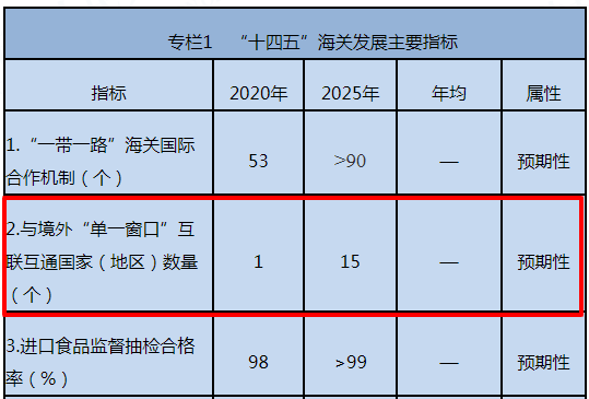 首个专栏聚焦“十四五”海关发展主要指标,其中一项是:到2025年,预期与境外“单一窗口”互联互通国家(地区)数量达15个。