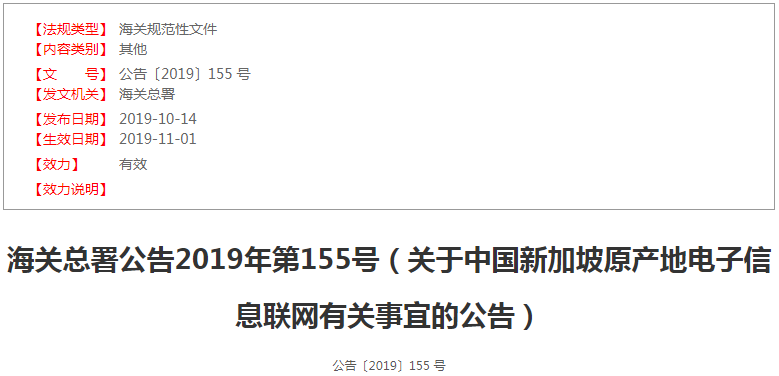 根据海关总署公告,自2019年11月1日起,“中国——新加坡原产地电子信息交换系统”正式运行。
