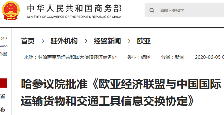 2020年底,《欧亚经济联盟与中国国际运输货物和交通工具信息交换协定》正式生效。联盟成员国中央海关和中国海关总署将作为信息交换的授权实施单位。