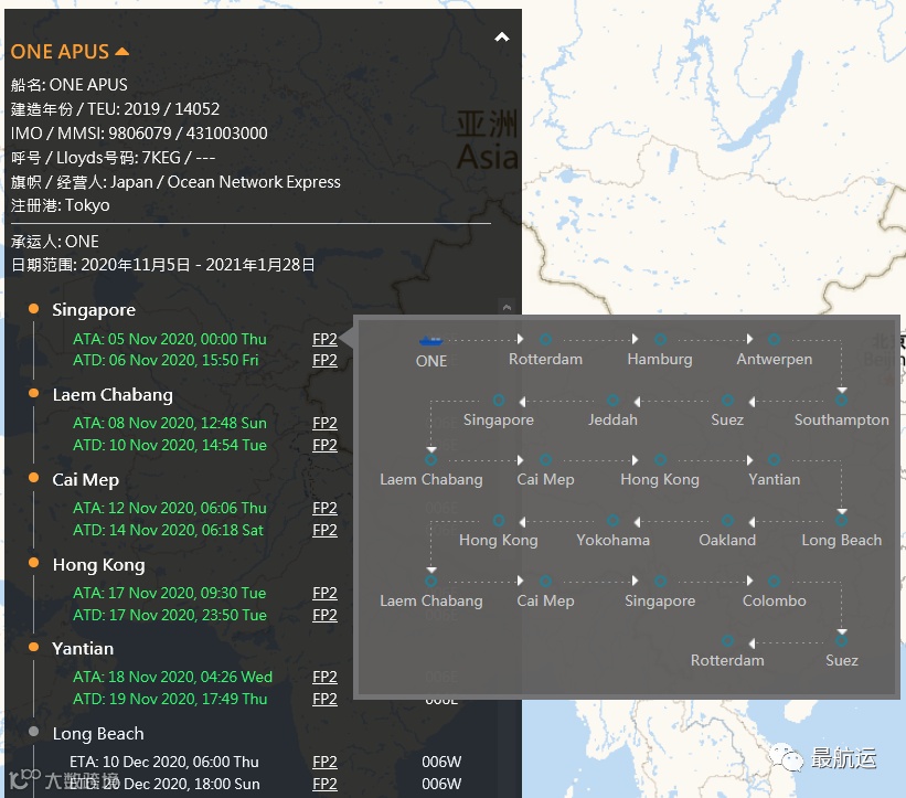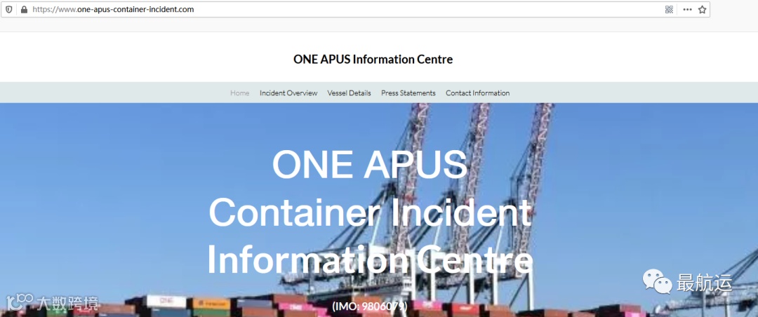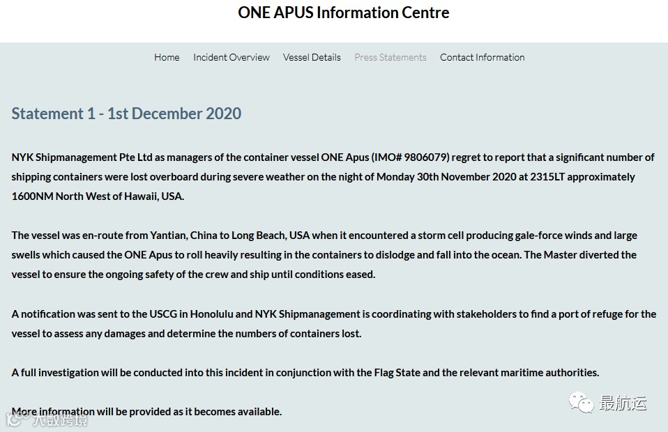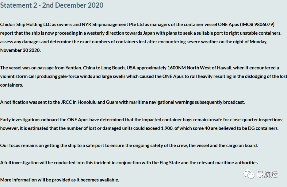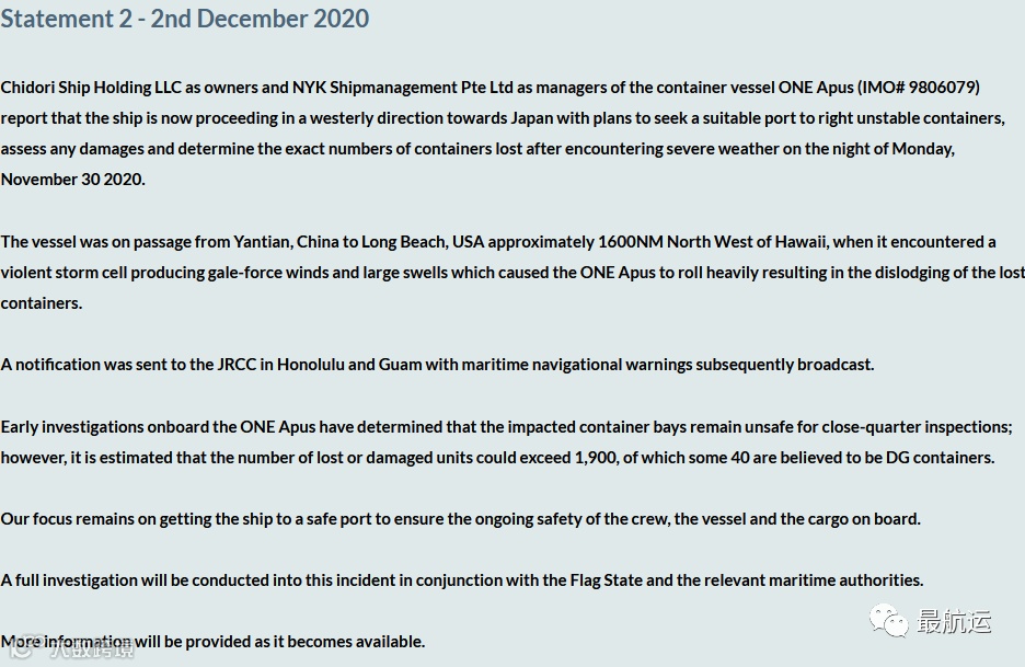 NYK Shipmanagement Pte Ltd作为集装箱船ONE APUS(IMO#9806079)的经营者,遗憾地报告,在美国夏威夷西北约1600NM处,于2020年11月30日(星期一)晚上的恶劣天气中,大量集装箱失水。