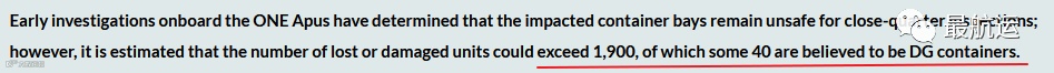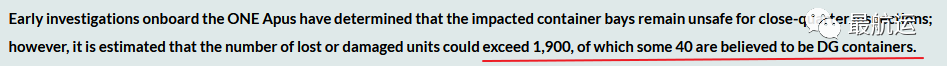 “ONE APUS”上的早期调查已确定,受影响的集装箱隔间在近距离检查时仍然不安全;但是,据估计,丢失或损坏的单元数量可能超过1900个,其中大约40个单元被认为是DG集装箱。