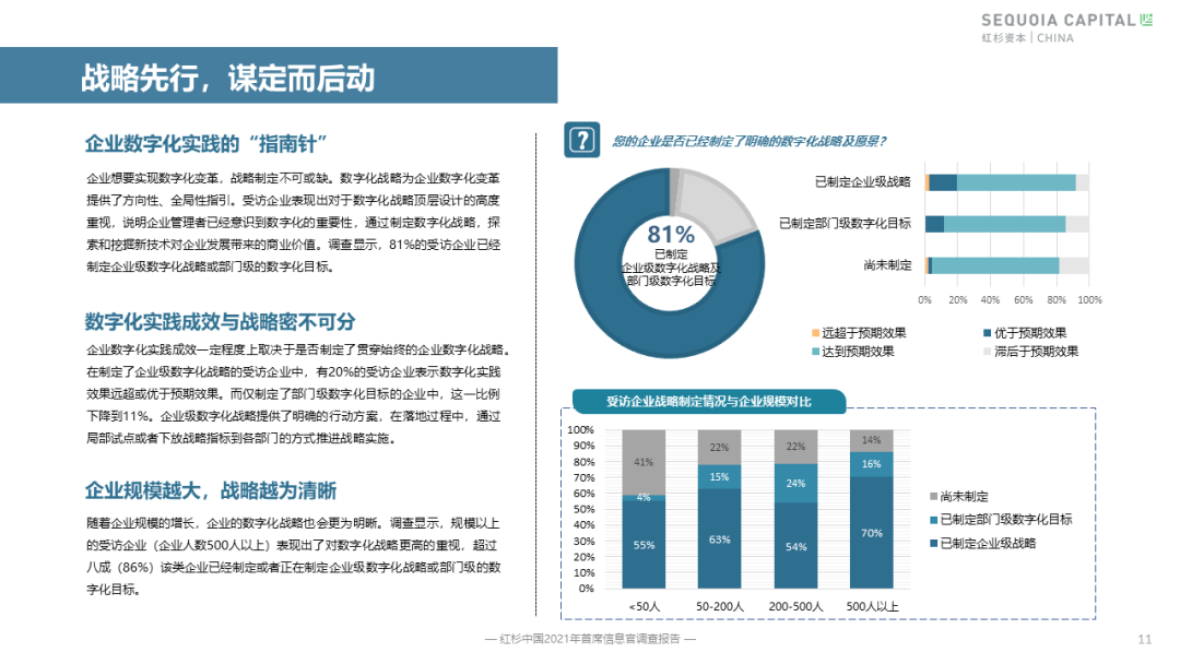 数字化发展的前期,大型企业是主要参与者,其更偏好自上而下地系统改革,基于业务流程梳理进行全面的数字化部署,因此其对于企业级数字化战略的制定也更为迫切。随着数字化进一步发展,中小企业逐步从观望者转化为参与者,但他们往往不具备足够的资源与技术进行全面改进,因此他们更多选择从业务部门出发,针对明确的需求和痛点,利用数字技术解决问题。