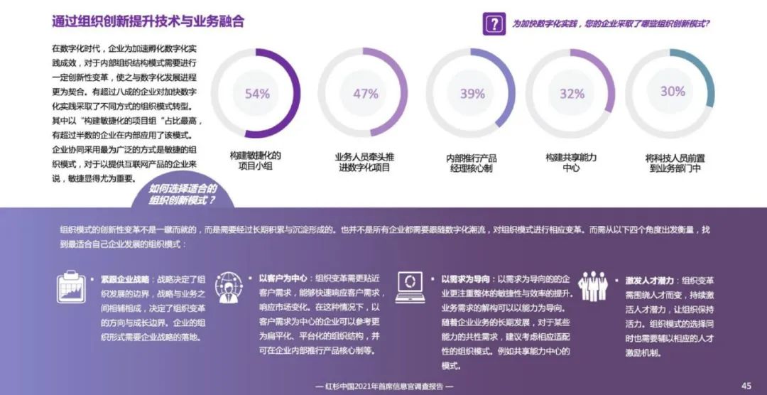 随着企业数字化进程的推进,数字化管理者的角色越来越重要,技术所发挥的影响力也逐步提升。数字化需要业务与技术双方的深入参与,如何通过更“敏捷”的组织模式和配套机制使业务和技术目标一致,实现高效协同是企业需要解决的一大问题。同时,数字化文化是培育企业数字化的土壤,也是构建企业协同组织必不可少的一环。