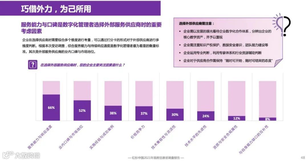 企业的数字化往往受限于数字化人才与技术能力的短缺,这一点对于中小企业尤为明显。因此,巧借外力,利用供应商快速构建自身的业务、数据、技术能力已成为中小企业的较佳选择。企业应以发展的眼光看待企业数字化合作体系,注重知识的转移,确保核心数字资产的自主可控。