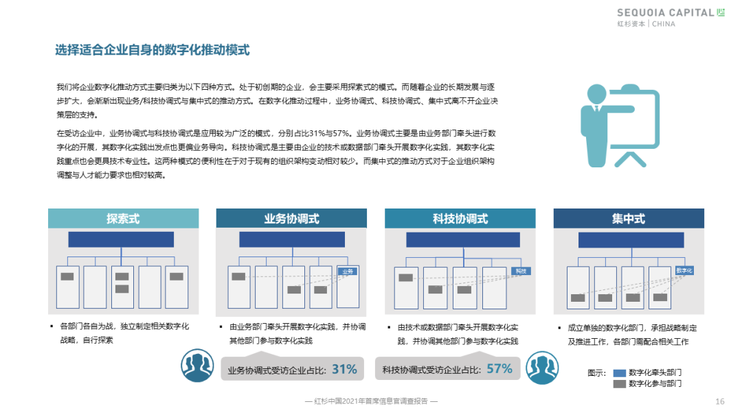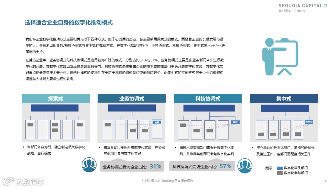 在受访企业中,业务协调式与科技协调式是应用较为广泛的模式,分别占比31%与57%。业务协调式主要是由业务部门牵头进行数字化的开展,其数字化实践出发点也更偏业务导向;科技协调式主要是由企业的技术或数据部门牵头开展数字化实践,其数字化实践重点也会更具技术专业性。这两种模式的便利性在于对于现有的组织架构变动相对较少。而集中式的推动方式对于企业组织架构调整与人才能力要求相对较高。