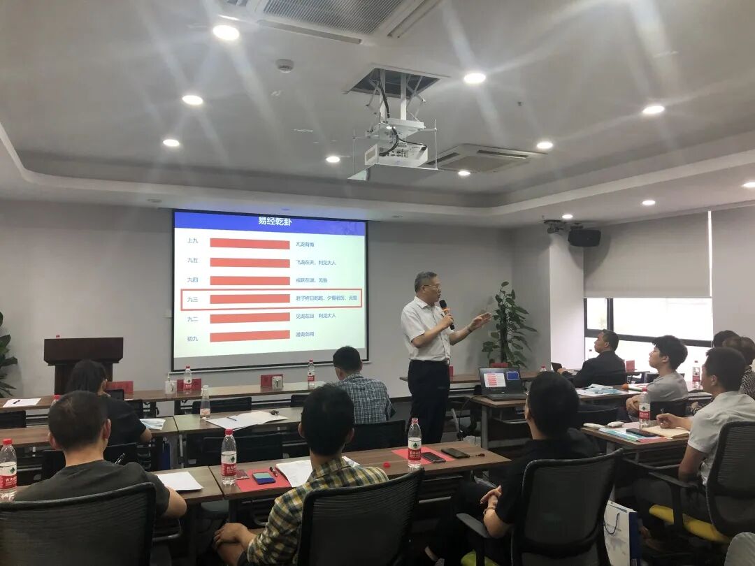 林峰教授为现场学员企业家带来《执行力与领导力的完美融合》的主题课程分享,他结合《易经·乾卦》等古人思维,将执行力的培养拆解成主动汇报、服从领导两个部分,同时通过案例结合思考的方式让学员们能深入明白其中涵义,以及需要遵守的准则。