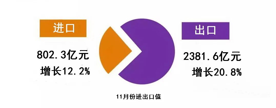 11月份,浙江省进出口总值3183.9亿元,增长18.5%,其中,出口2381.6亿元,增长20.8%,进口802.3亿元,增长12.2%。