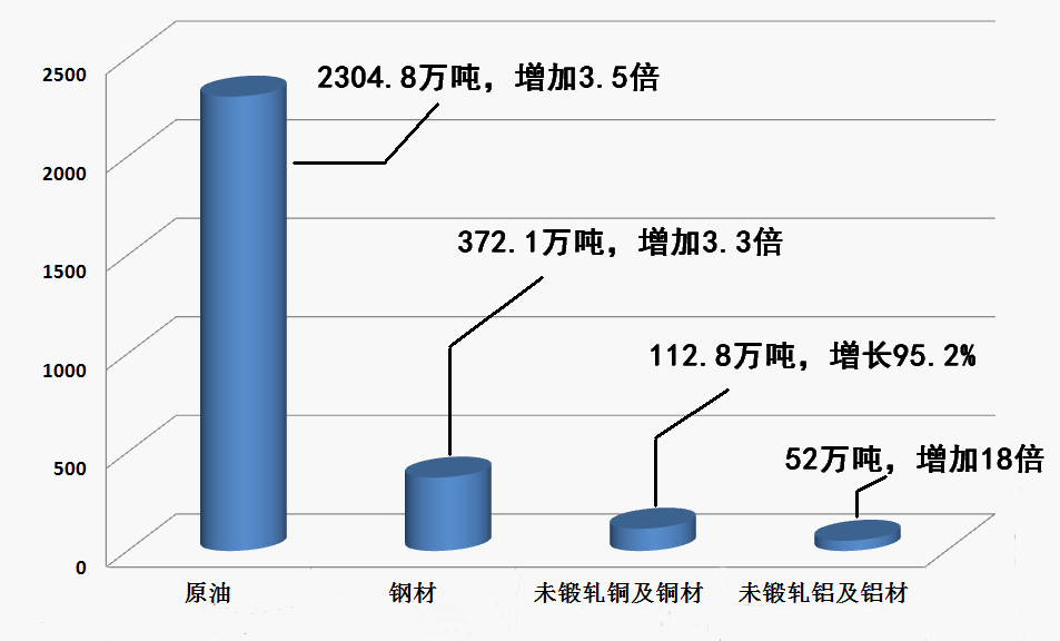 1-11月,全省进口原油、钢材、未锻轧铜及铜材、未锻轧铝及铝材分别为2304.8、372.1、112.8、52万吨,分别增加3.5倍、3.3倍、95.2%和18倍,合计拉动全省进口值增长9.8个百分点。同期,全省进口消费品764.8亿元,增长19.2%,其中,化妆品进口增长42.0%。