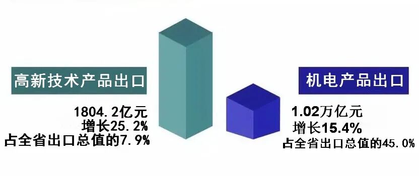 1-11月,全省出口高新技术产品1804.2亿元,增长25.2%,占全省出口总值的7.9%,较去年同期提升1.0个百分点。同期,机电产品出口1.02万亿元,增长15.4%,占全省出口总值的45.0%,较去年同期上升2.3个百分点。其中,家电出口增长22.6%,电动汽车和手机出口分别增长6.1倍和1.8倍。劳密产品出口7684.9亿元,增长2.8%,占全省出口总值的33.8%,较去年同期下降2.2个百分点。