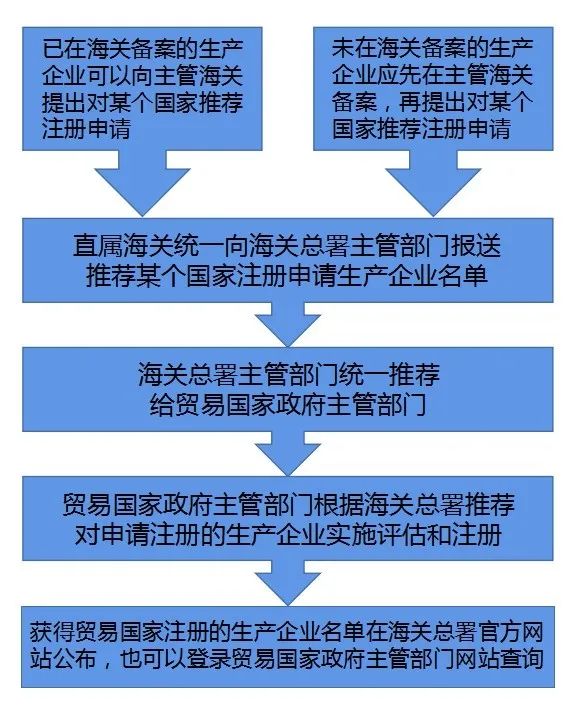 贸易国家官方主管机构一般通过两种方式给予注册资格,一种方式是派出关员到企业现场进行检查,另一种方式是由我国官方主管部门推荐企业名单,贸易国家直接认可。这两种方式的前提都是由海关总署统一将企业名单推荐给贸易国家主管部门。如果广大食品企业想了解我国哪些企业的哪些类别食品获得了哪些国家注册,请点击下面这个链接: