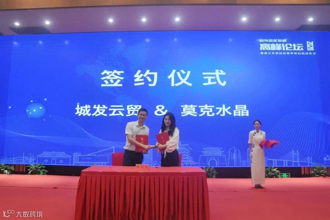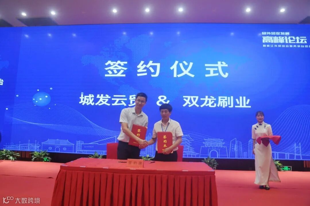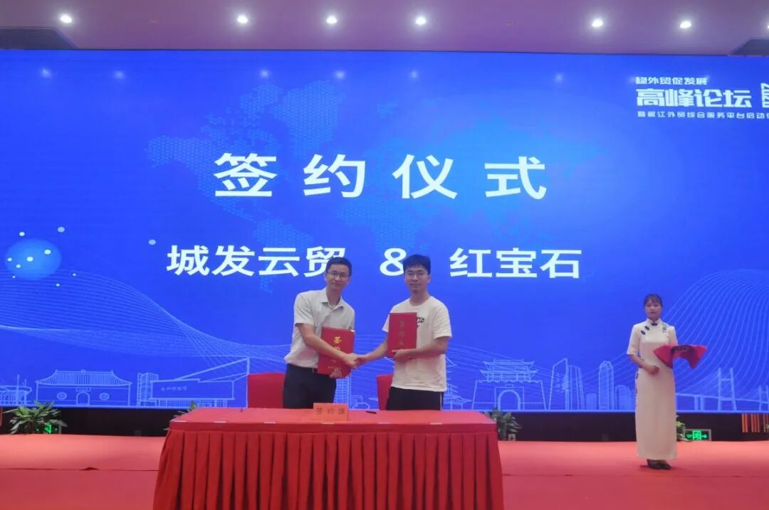 接下来进行平台项目合作签约仪式。城发云贸公司与双龙刷业、莫克水晶、红宝石三家首批合作单位签署外贸综合服务协议。