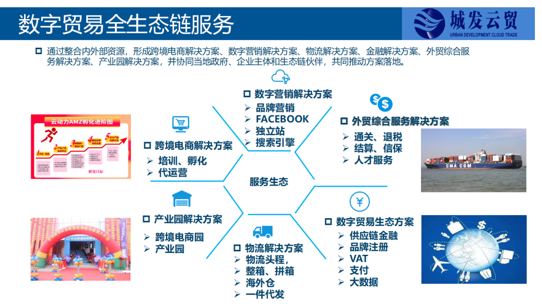 浙江城发云贸国际供应链有限公司(简称城发云贸)是台州市椒江区首个国资控股的外贸综合服务平台,也是台州首个外贸+跨境电商为一体的综合运营服务平台。