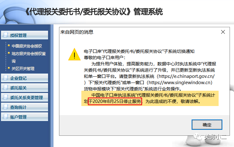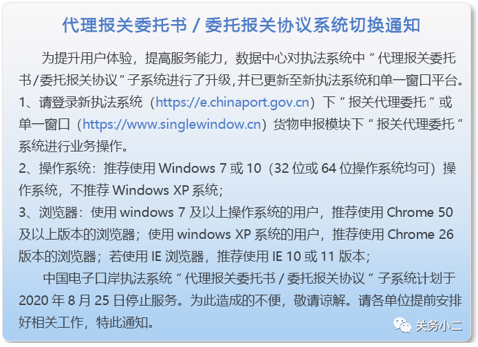 中国电子口岸执法系统“代理报关委托书/委托报关协议”子系统计划于2020年8月25日停止服务,为此造成的不便,敬请谅解。