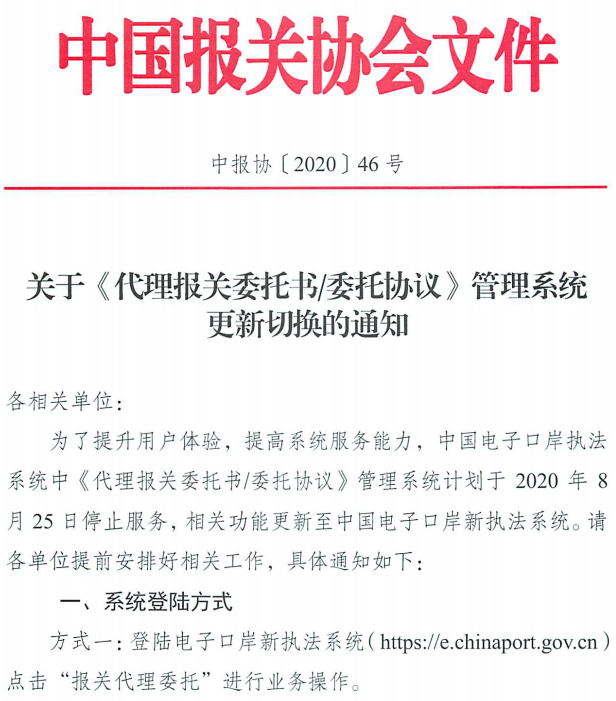 中国报关协会关于《代理报关委托书/委托协议》管理系统更新切换的通知: