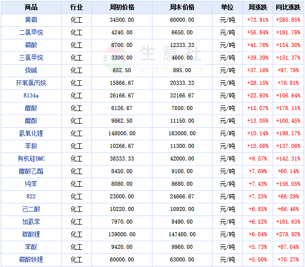 云贵黄磷价格大涨。数据显示,周初报盘34500元/吨,周末已涨至60000元/吨,周内涨幅73.91%,同比涨幅285.85%。