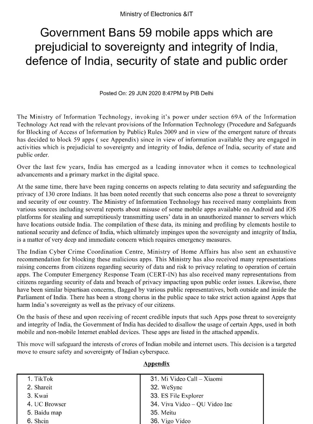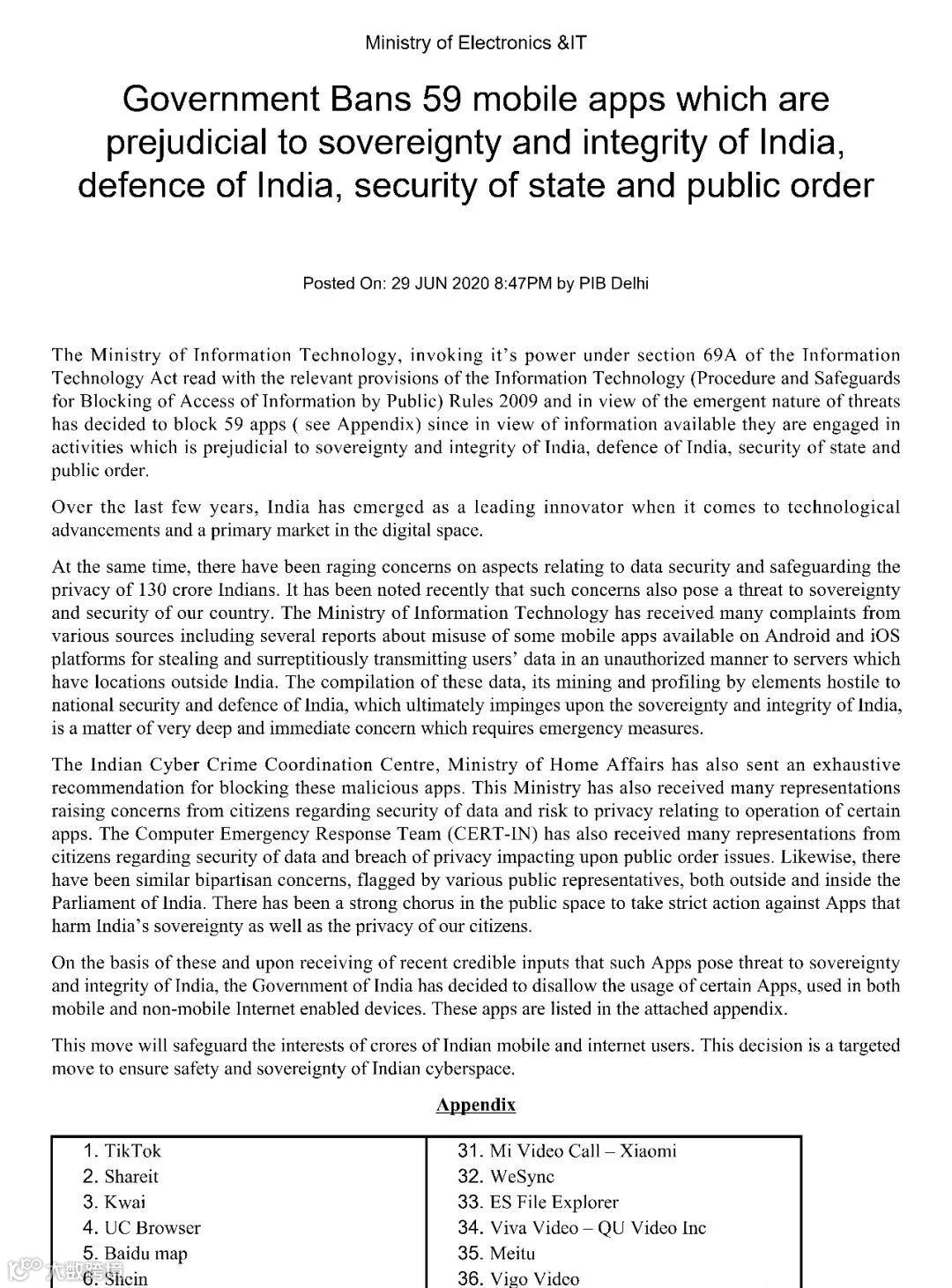 与在进口中国货物的暗箱操作不同,对中国应用的封禁上,印度政府电子与信息技术部是正式公开发令规定如下,打击面不要太广,比如对于平时用Wechat微信联系的客户,比如在印度有1.2亿用户全球第二大市场的海外版抖音TikTok...