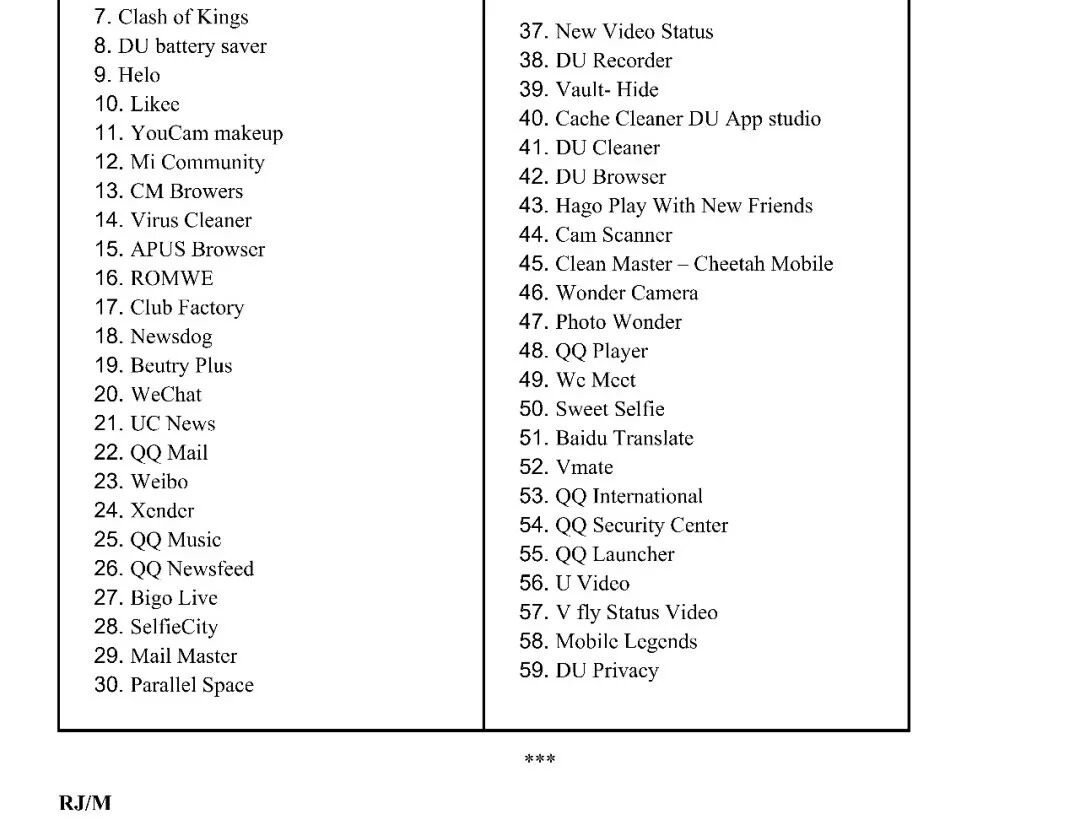 TikTok(抖音), Shareit(茄子快传), Kwai(快手), UC Browser(UC浏览器), Baidu map(百度地图), Shein, Clash of Kings(列王的纷争), DU battery saver(百度电池保护), Helo, Likee(原Like短视频), YouCam makeup(玩美彩妆), Mi Community(小米社区), CM Browser(CM浏览器), Virus Cleaner(病毒清理), APUS Browser(APUS浏览器), ROMWE, Club Factory, Newsdog, Beauty Plus(美颜相机), WeChat(微信), UC News(UC新闻), QQ Mail(QQ邮箱), Weibo(微博), Xender(闪传), QQ Music(QQ音乐), QQ Newsfeed(QQ新闻), Bigo Live, SelfieCity, Mail Master(邮箱大师), Parallel Space, Mi Video Call – Xiaomi(小米视频通话), WeSync(QQ同步助手), ES File Explorer(ES文件浏览器), Viva Video – QU Video Inc(小影), Meitu(美图), Vigo Video(火山短视频), New Video Status, DU Recorder, Vault- Hide, Cache Cleaner DU App studio, DU Cleaner, DU Browser(百度浏览器), Hago Play With New Friends, Cam Scanner(全能扫描王), Clean Master – Cheetah Mobile(清理大师), Wonder Camera(百度魔拍), Photo Wonder(百度魔图), QQ Player(QQ影音), We Meet, Sweet Selfie, Baidu Translate(百度翻译), Vmate, QQ International(QQ国际版), QQ Security Center(QQ安全中心), QQ Launcher(QQ桌面), U Video, V fly Status Video, Mobile Legends, DU Privacy.