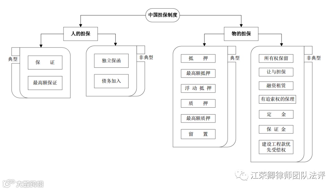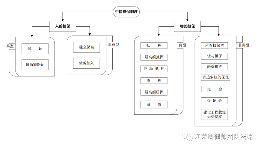 担保分为人的担保和物的担保。典型的人的担保包含保证和最高额保证,非典型的人的担保包括独立保函和债务加入。典型的物的担保包括抵押、最高额抵押、浮动抵押、质押、最高额质押和留置,非典型的物的担保包括所有权保留、让与担保、融资租赁、有追索权的保理、保证金、定金以及建设工程优先受偿权。