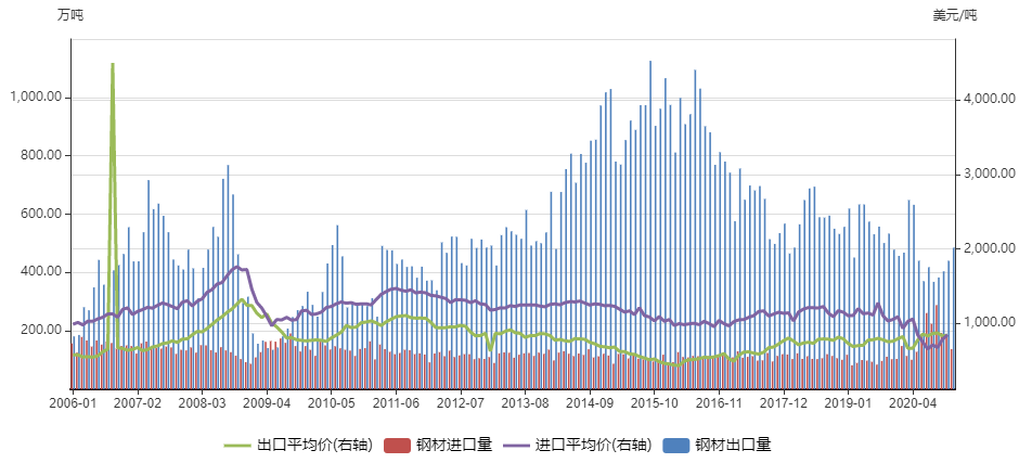 图1-3 2006年-2020年我国钢材进出口情况变化