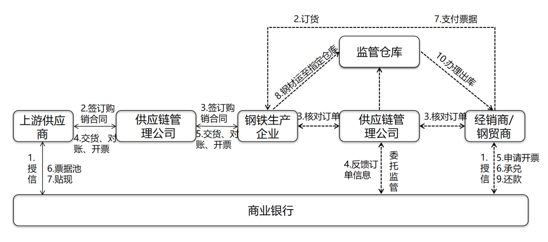 当供应链中的下游经销商/钢贸商与钢铁生产企业发生贸易,需要提前支付给钢铁生产企业货物款,钢铁生产企业支持用票据支付,于是钢贸商、钢铁生产企业与商业银行签订三方协议,商业银行基于核心企业的信用,对下游钢贸商企业提供授信。下游钢贸商同钢铁生产企业订货,商业银行委托其认可的供应链管理公司进行订单管理并反馈订单信息,确认好授信额度后,钢贸商可向商业银行申请开票和承兑并支付票据给钢铁生产企业,供应链管理公司对资金流和物流进行监控和管理,待钢贸商销售回款并还款给商业银行后,供应链管理公司通知仓库交货,办理货物出库。从而解决了经销商/钢贸商预付款的资金缺口。