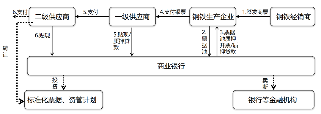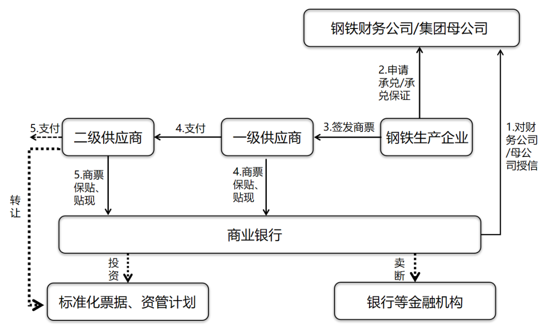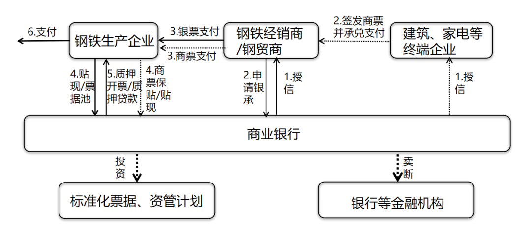 在经销商/钢贸商的下游还存在建筑、家电等大型下游终端企业,这些企业往往有商业银行的授信,他们可以签发商票支付给经销商,经销商继续支付给钢铁生产企业,钢铁生产企业收到商承后可继续背书支付流转,也可以选择向商业银行申请商票保贴贴现,商业银行基于对核心企业的授信,为钢铁生产企业办理贴现。