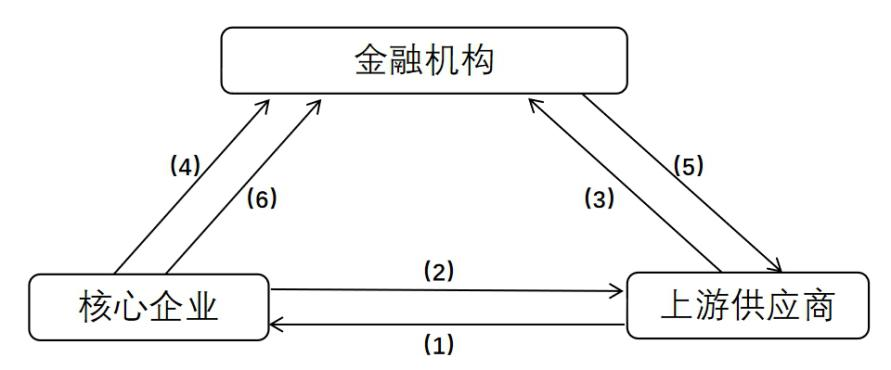 具体流程如下图2-1:(1)钢铁行业核心企业与上游供应商铁矿石、焦炭等企业之间签订《采购协议》;(2)核心企业钢铁生产企业签收采购材料,形成应收账款;(3)上游供应商将应收账款债权转让或质押给银行申请融资;(4)银行和供应商通知核心企业,核心企业向金融机构提供应收账款相关文件并签署到期付款承诺成为债务人;(5)银行向供应商授信放款;(6)核心企业根据约定到期支付货款。