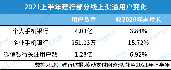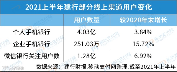 截至报告期末,建行个人手机银行用户数4.03亿户,较上年末增长3.84%,月活用户数1.42亿户,交易笔数265.10亿笔,交易额47.15万亿元;企业手机银行用户数251.03万户,较上年末增长15.72%,交易笔数860.41万笔,交易额9751.00亿元;微信银行关注用户数1.28亿户,较上年末增长6.92%,其中绑卡用户数1.04亿户,较上年末增长9.70%。
