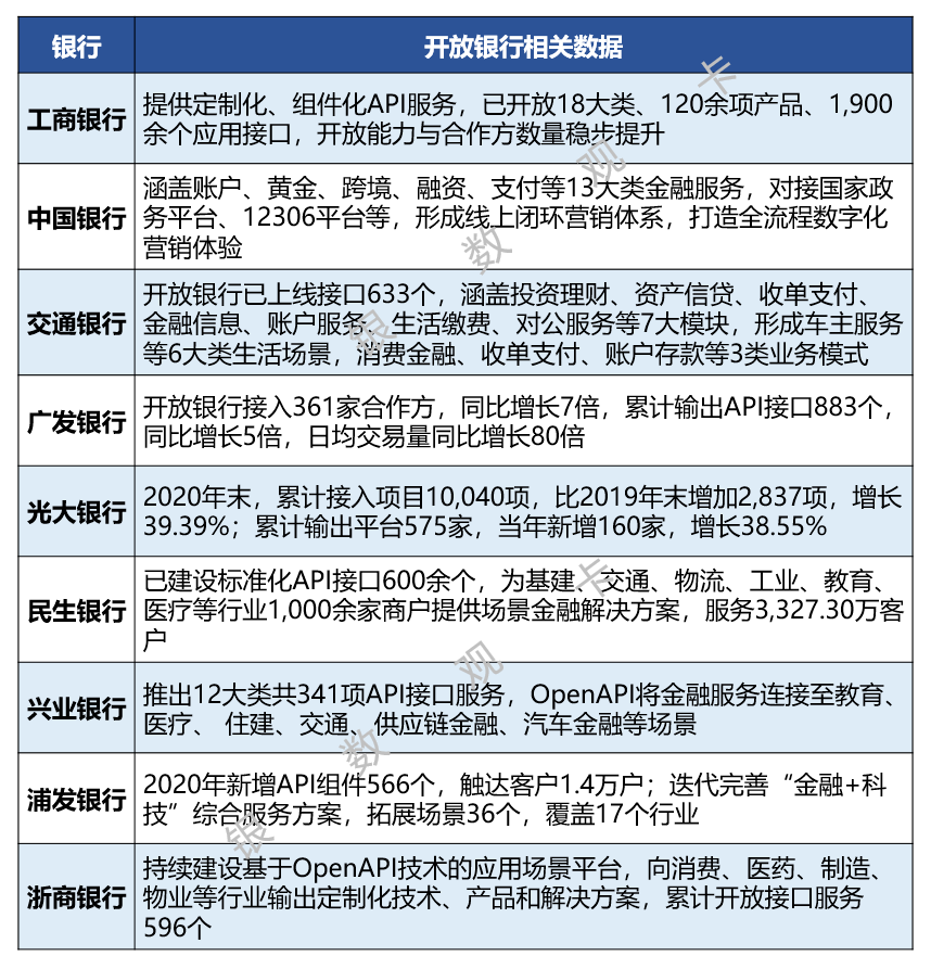 《中国开放银行白皮书2021》分析认为,2020年之前,中国开放银行已经经历了两代,即“银企直联”和“Open API”,而在2020年之后,将迈入“Open API+”新阶段。此阶段的开放银行以PaaS层开放为标志,输出原子化产品的同时,在输出自有金融产品与服务的基础上,输出来自保险公司、资管公司、租赁公司甚至银行同业的金融产品与服务,并拓宽至政务服务、中小银行赋能等场景。新阶段的开放银行构建,对各银行在金融科技方面的资金、时间、人力投入提出了更高的要求。