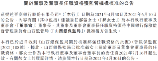 作为一家港股上市银行,晋商银行于7月19日晚间发布公告称,山西银保监局已于日前核准郝强晋商银行董事长的任职资格。