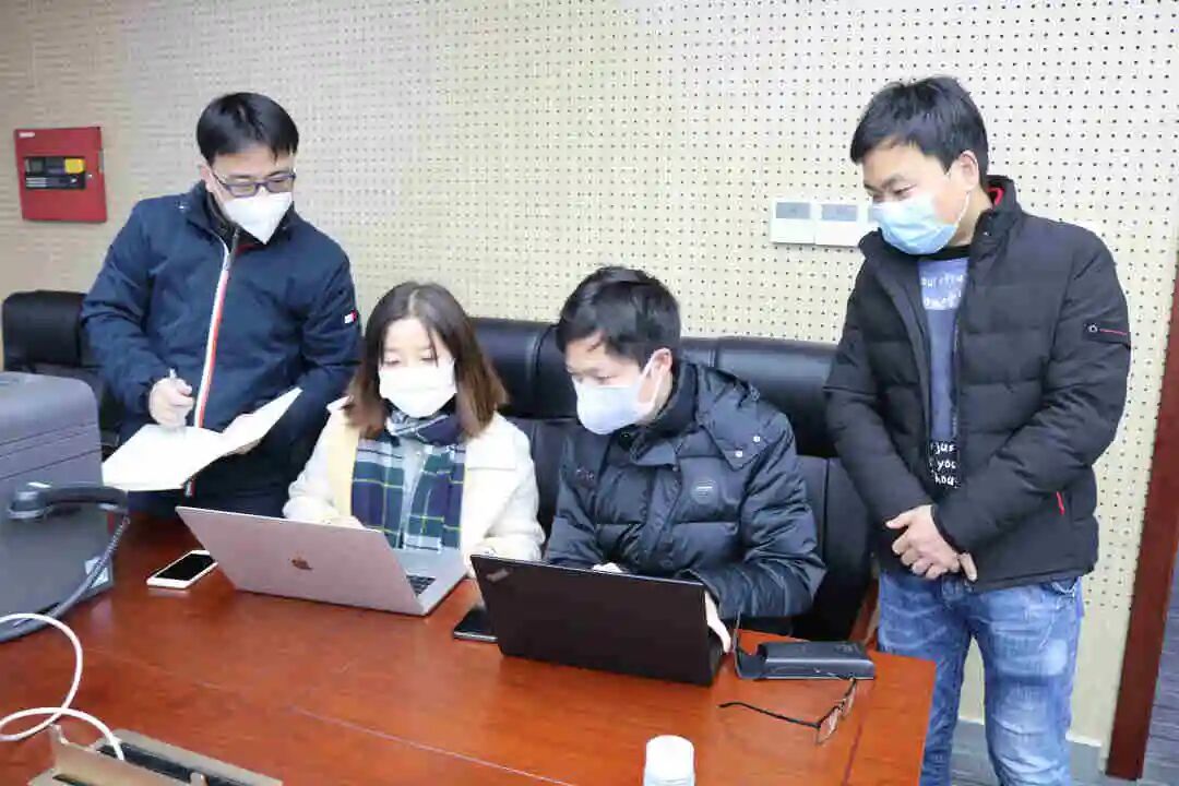 图为张军(左一)正在跟同事研究企业电力复工指数。