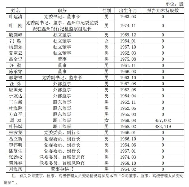 至此,温州银行新一届高管正式完成换届,新任董事长、监事长及行长均为浙江省农村信用社联合社选派。陈宏强此前曾任鹿城农商行董事长等职务,邢岛曾任萧山农商行监事长、副行长等职务。此外,温州银行副行长柴雷鹰曾任杭州联合农商行副行长。