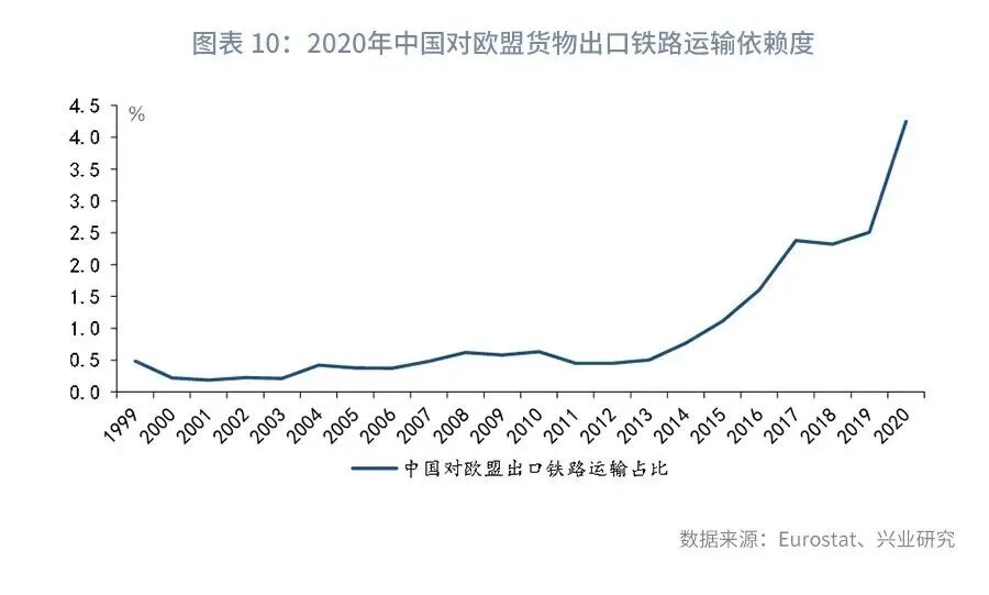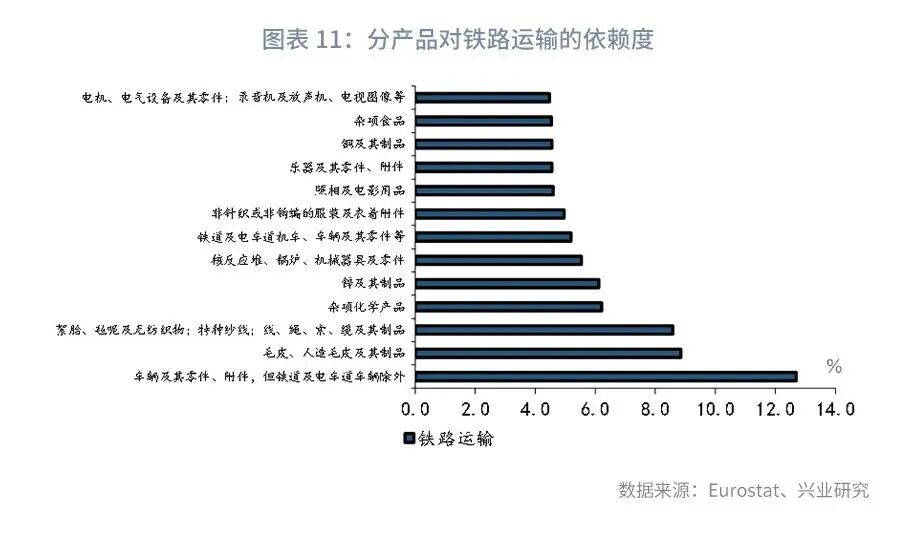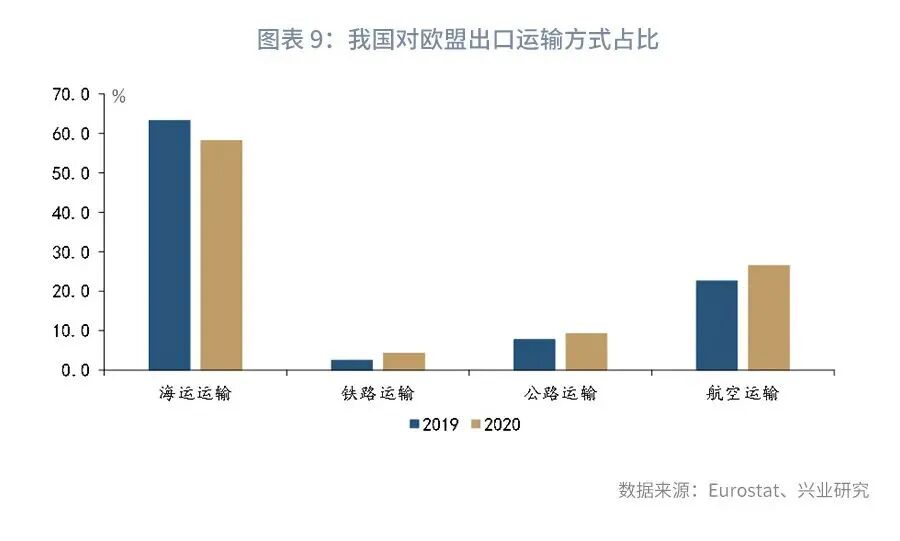 需要指出的是,伴随海运运输成本上升,部分产品运输方式由海运运输开始转向航空、铁路、公路等方式。数据显示,疫情爆发以后,我国对欧盟出口重,铁路运输、公路运输及航空运输占比分别上升1.7、1.5和3.9个百分点,参见图表9。这意味着,对铁路运输、公路等运输依赖度较高的货物,其受海运运输不畅影响也相对较小。具体而言: