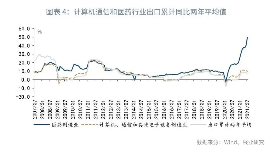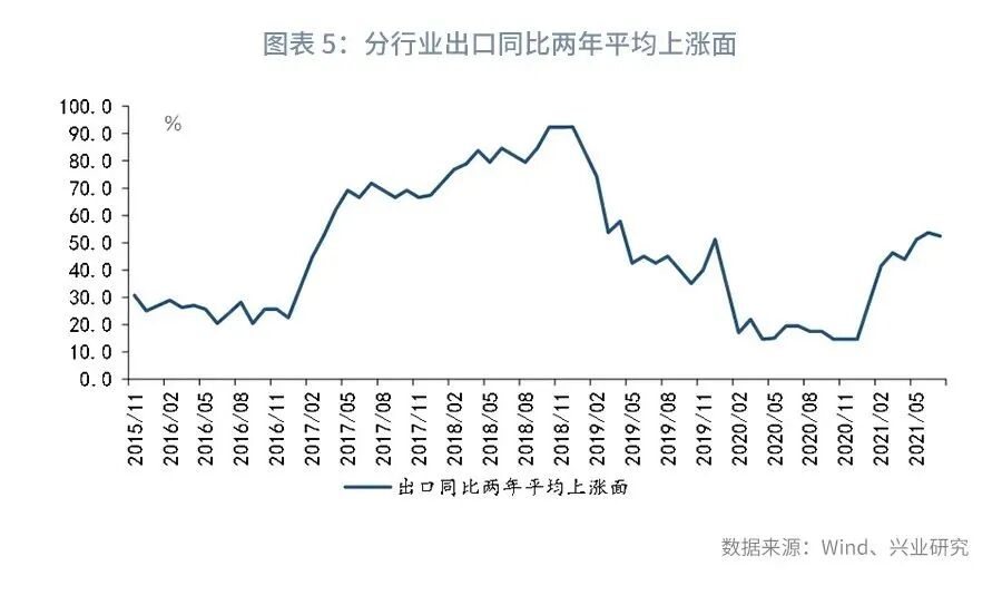 需要指出的是,与运价飙升相比,运费与出口总值比重相对较为稳定。这或主要是由于出口结构性分化所致。在疫情期间,单位价值高而体积小的货物出口表现好于单位价值低而体积大的货物。最为典型的是,与疫情相关的计算机通信及医药行业出口高增长(图表4),而其他出口附加值低但体积大的产品增长低迷。2020年我国出口呈少数产品贡献多数增长的特征,以两年平均增速来看,截至2020年12月,仅有14.6%的行业出口两年平均增速高于去年两年平均,参见图表5。