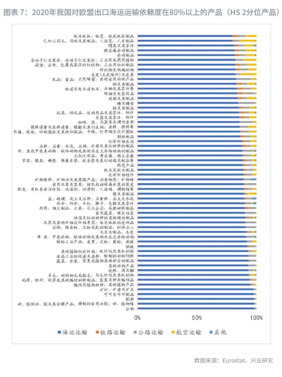 受集装箱短缺、港口拥堵、员工短缺等因素影响,海运运输不畅是运费上涨的主要矛盾。这或导致,高度依赖于海运运输方式的产品出口承受着更多的运费上涨之重。具体来看,在我国对欧盟出口中,以海运运输为主的商品主要有以下几类(参见图表7):