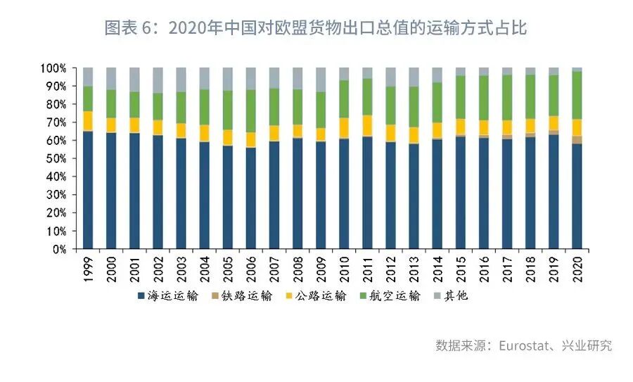 按照运输工具划分,目前国际贸易运输方式主要有海运运输、铁路运输、公路运输、航空运输等。目前,我国出口高度依赖海运运输。以我国对欧盟出口运输方式为例,2020年我国对欧盟海运运输出口占我国对欧盟出口总值的58.2%,随后依次为航空运输(26.5%),公路运输(9.3%)和铁路运输(4.2%),参见图表6。