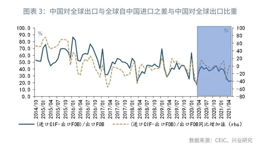 理论上,我们可用出口FOB价与进口CIF价轧出我国出口货物所用运费。 需要指出的是,受转口贸易、统计时间点、汇率结算时间点不一致等影响,二者差值并不完全等同于运费。本文用IMF统计的中国对全球离岸出口价格与全球自中国进口到岸价格数据作差,轧出中国出口产品的运费。